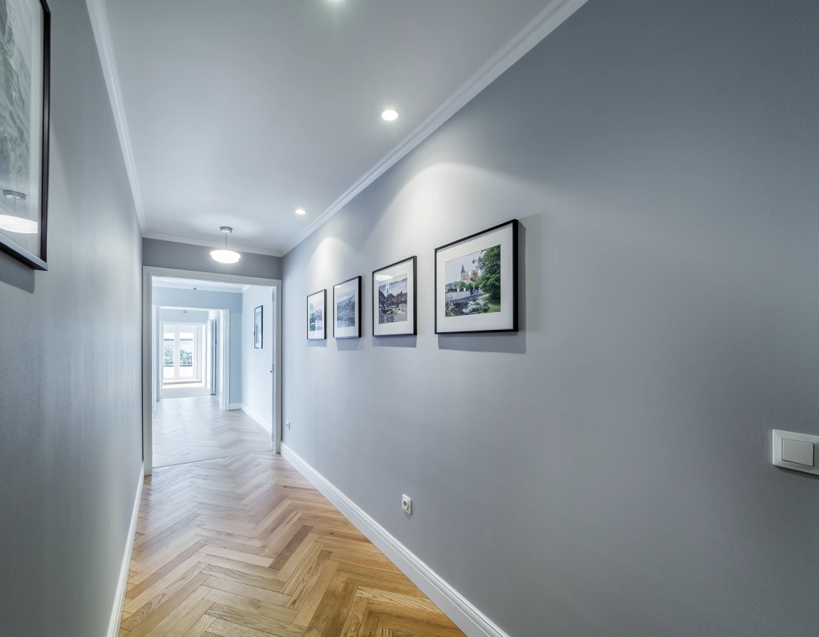 Conseil pratique : Dans les couloirs très fréquentés avec enfants, appliquez deux couches de peinture satinée de qualité professionnelle. L’investissement se rentabilise par la durabilité.